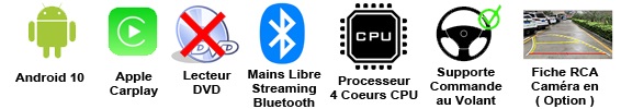 Découvrez notre Autoradio Gps entièrement tactile avec la Navigation intégrée, kit mains libres Bluetooth et streaming Audio, système d'exploitation Android 10.0, ports USB, WIFI pour la connexion internet et accès au PlayStore. L'écran tactile dispose également de la fonction Apple Carplay pour iPhone via USB. Fonction Radio numérique. Installation simple & Rapide sans aucune modification, reprise de votre faisceau d’origine.